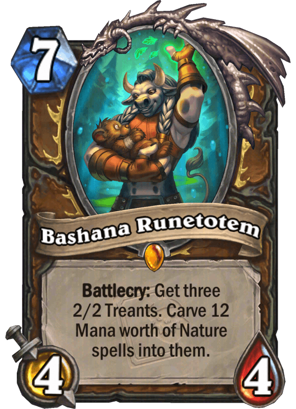 Bashana Runetotem: 7 Mana, 4/4, Legendary. Battlecry: Kapsz három 2/2-es Treantot. Faragj beléjük 12 Manányi Nature spellt.