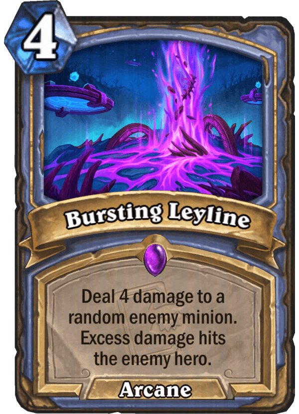 Bursting Leyline: 4 Mana, Epic, Arcane, Spell. 4-et sebez egy véletlenszerűen kiválasztott ellenséges lénynek. A fennmaradó sebzés az ellenséges hőst sebzi.