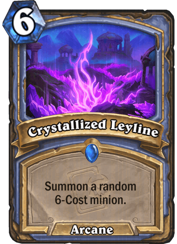 Crystallied Leyline: 6 Mana, Rare, Arcane, Spell. Megidéz egy véletlenszerűen kiválasztott 6 Manaás lényt.