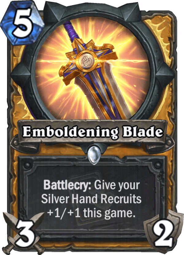 Emboldening Blade: 5 Mana, 3/2, Common. Battlecry: A Silver Hand Recruitjaidnak +1/+1-et ad ezen a meccsen.