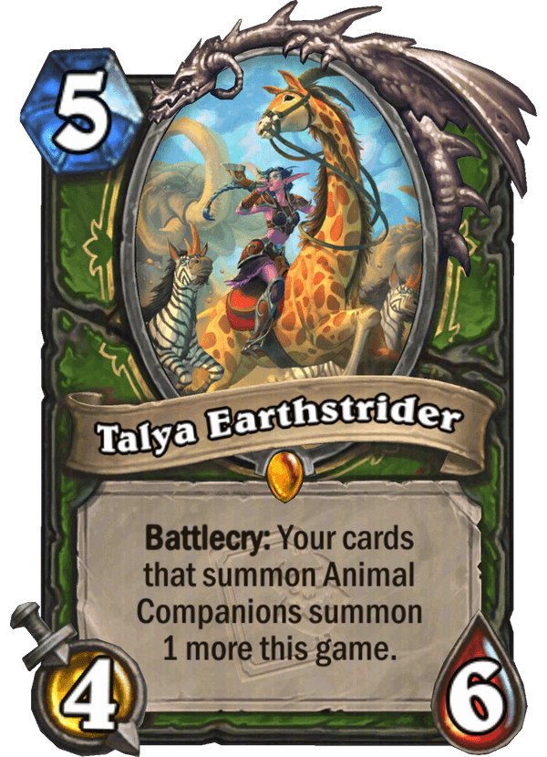 Talya Earthstrider: 5 Mana, 4/6, Legendary. Battlecry: A kártyáid, amelyek Animal Companionokat idéznek meg, 1-gyel többet idéznek meg belőlük.