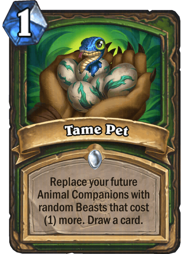 Tame Pet: 1 Mana, Common, Spell. Lecseréli a jövőbeli Animal Companionjaidat olyan véletlenszerűen kiválasztott Beastekre, amelyek 1-gyel többe kerülnek. Húzol egy lapot.