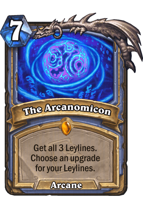 The Arcanomicon: 7 Mana, Legendary, Arcane, Spell. Megkapod mind a 3 Leyline-t. Válassz egy fejlesztést a Leyline-jaidnak.