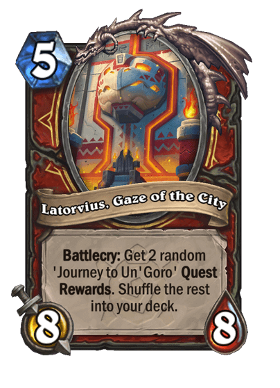 - Latorvius, Gaze of the City: 5 Mana, 8/8. Battlecry: Kapsz 2 véletlenszerűen kiválasztott 'Journey to Un'Goro' Quest jutalmat. A többit belekeveri a paklidba.