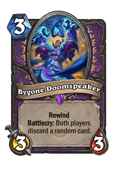 - Bygone Doomspeaker: 3 Mana, 3/3, Epic. Rewind. Battlecry: Mindkét játékos eldob egy véletlenszerűen kiválasztott lapot.