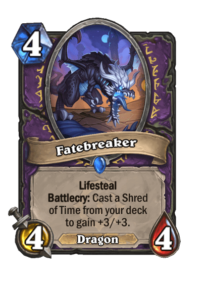 - Fatebreaker: 4 Mana, 4/4, Rare, Dragon. Lifesteal. Battlecry: Elhasznál egy Shred of Time-ot a paklidból, hogy ez +3/+3-at kapjon.