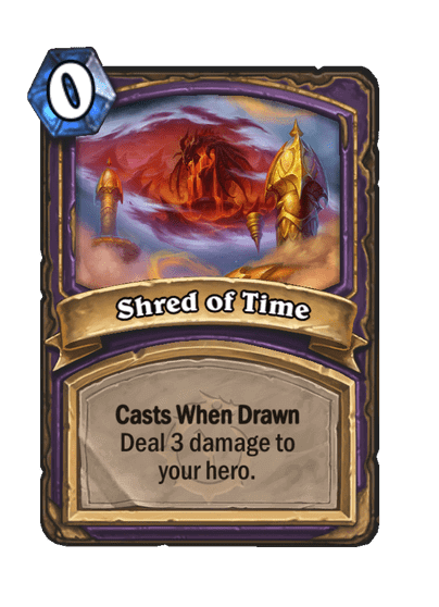 - Shred of Time: 0 Mana. Elhasználódik, amikor felhúzod. 3-at sebez a hősödnek.
