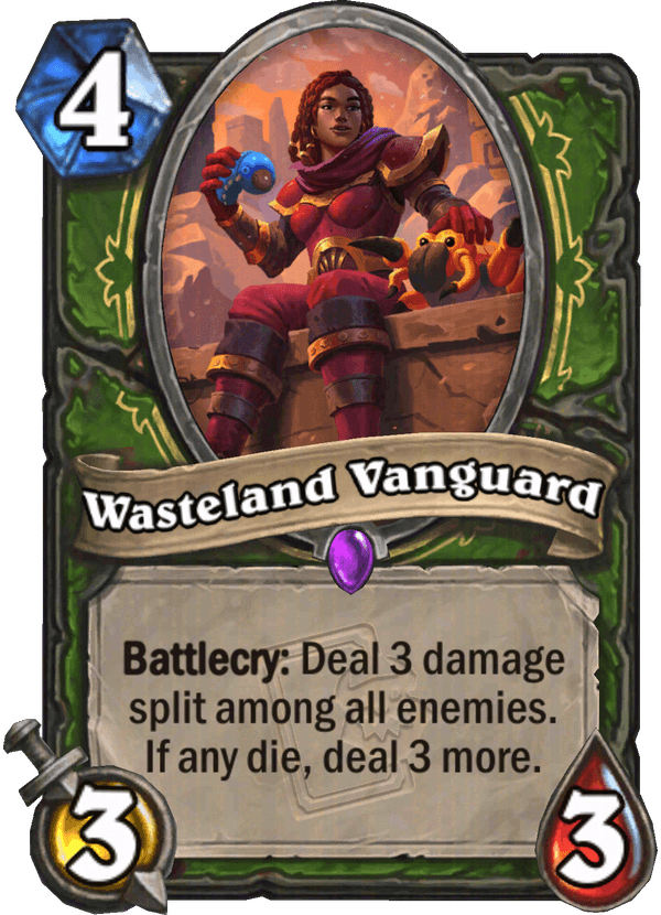 - Wasteland Vanguard: 4 Mana, 3/3, Epic. Battlecry: 3-at sebez szétosztva az összes ellenség között. Ha bármelyik meghal, sebez még 3-at.