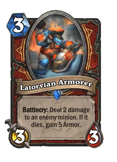 - Latorvian Armorer: 3 Mana, 3/3, Rare. Battlecry: 2-t sebez egy ellenséges lénynek. Ha az meghal, akkor kapsz 5 Armort.