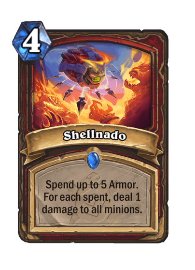 - Shellnado: 4 Mana, Rare, Spell. Költs el legfeljebb 5 Armort. Minden egyes elköltött Armor után 1-et sebez az összes lénynek.