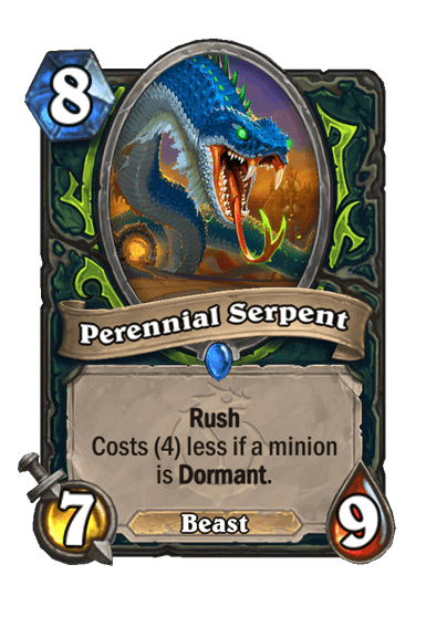 - Perennial Serpent: 8 Mana, 7/9, Rare, Beast. Rush. 4-gyel kevesebbe kerül, ha egy lény alszik.