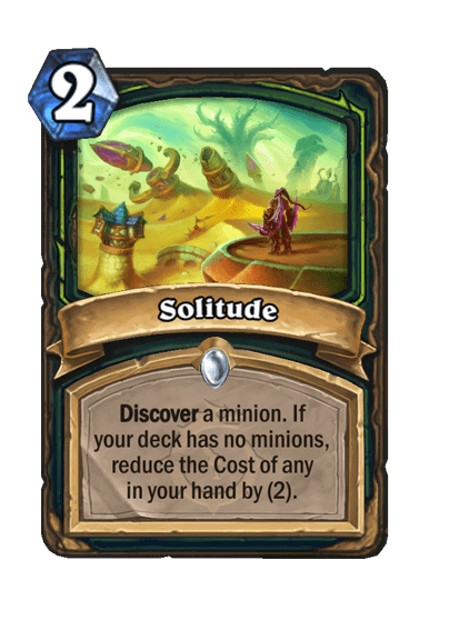 - Solitude: 2 Mana, Common, Spell. Felfedezel (Discover mechanizmus) egy lényt. Ha a paklidban nincsenek lények, akkor a kezedben lévőknek a Manaköltségét lecsökkenti 2-vel.