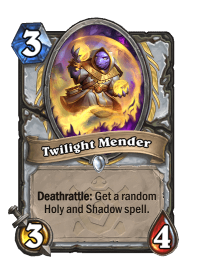 - Twilight Mender: 3 Mana, 3/4, Common. Deathrattle: Kapsz egy véletlenszerűen kiválasztott Holy és Shadow spellt.