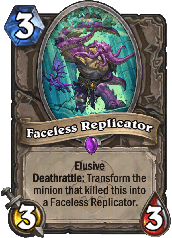 - Faceless Replicator: 3 Mana, 3/3, Epic. Elusive. Deathrattle: Átalakítja egy Faceless Replicatorrá azt a lényt, amelyik megölte ezt.
