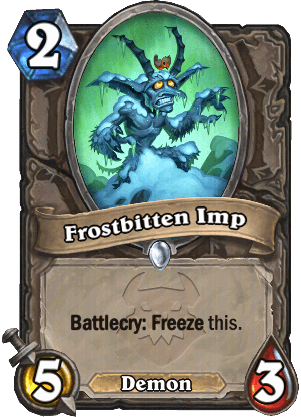 - Frostbitten Imp: 2 Mana, 5/3, Common, Demon. Battlecry: Lefagyasztja ezt.