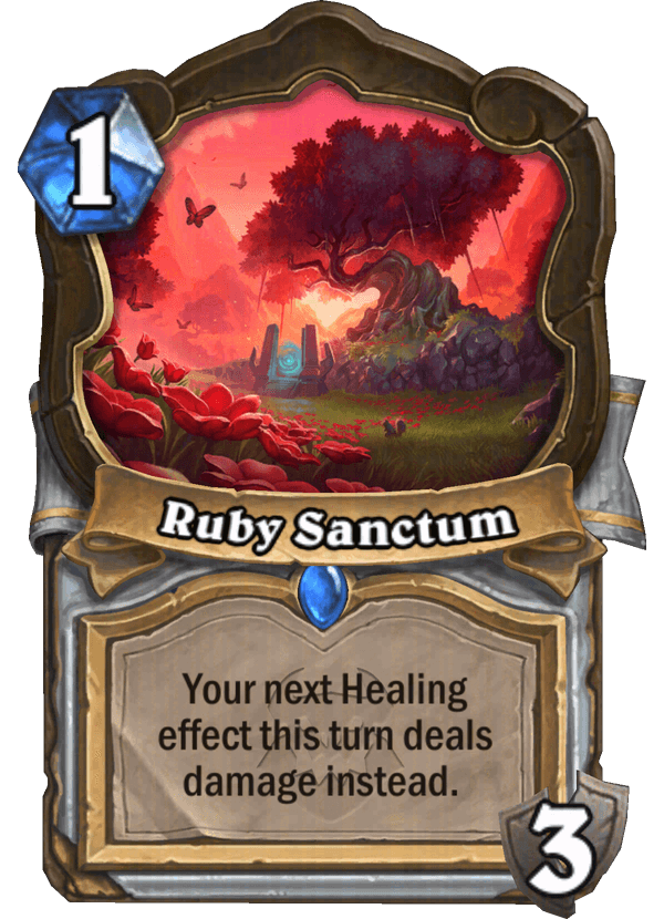 - Ruby Sanctum: 1 Mana, 3 Armor, Rare, Priest, Helyszín. A következő gyógyító képességet ebben a körben gyógyítás helyett sebez.