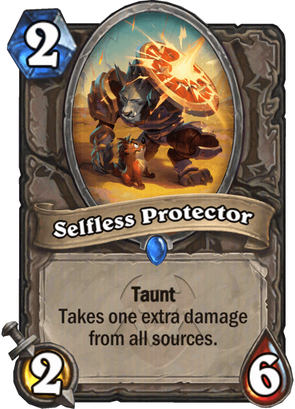 - Selfless Protector: 2 Mana, 2/6, Rare. Taunt. Eggyel többe sebzést kap minden forrásból.