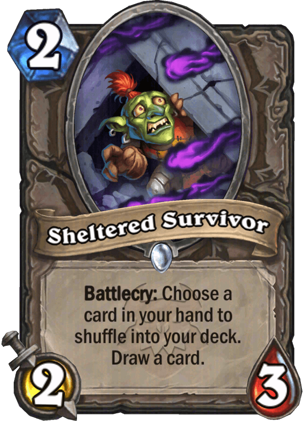 - Sheltered Survivor: 2 Mana, 2/3, Common. Battlecry: Válassz ki egy kártyát a kezedben, amit belekeversz a paklidba. Húzol egy lapot.