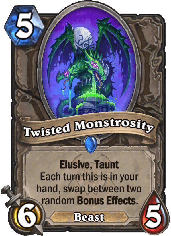 - Twisted Monstrosity: 5 Mana, 6/5, Rare, Beast. Elusive. Taunt. Minden egyes körben, amíg ez a kezedben van, két véletlenszerűen kiválasztott bónusz képesség közt vált.