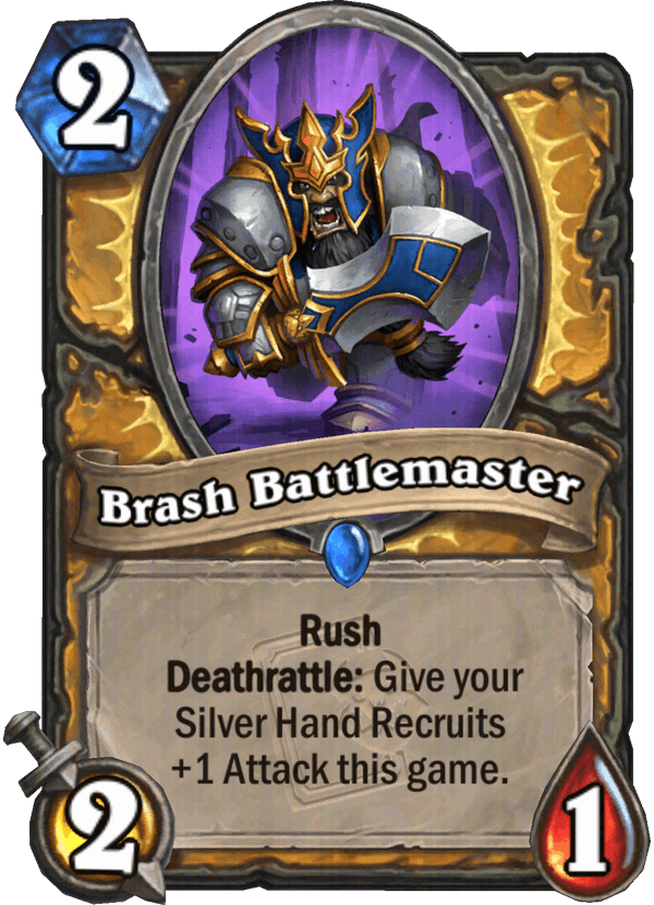 - Brash Battlemaster: 2 Mana, 2/1, Rare. Rush. Deathrattle: A Silver Hand Recruitjaidnak +1 Támadást ad ezen a meccsen.