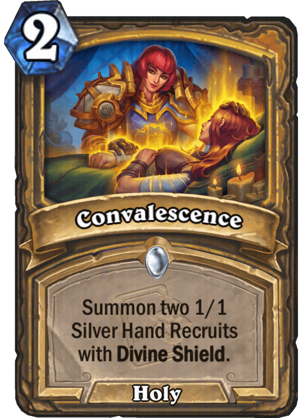 - Convalescence: 2 Mana, Common, Holy, Spell. Megidéz két 1/1-es Silver Hand Recruitot Divine Shield-del.