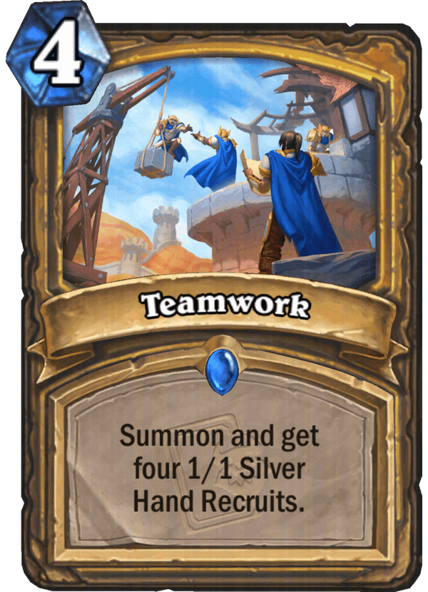 - Teamwork: 4 Mana, Rare, Spell. Megidéz négy 1/1-es Silver Hand Recruitot és kapsz is négyet.