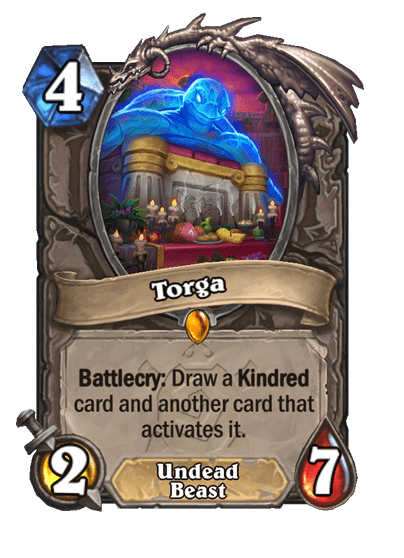 - Torga: 4 Mana, 2/7, Legendary, Undead, Beast. Battlecry: Húzol egy Kindred lapot és egy másikat, ami aktiválja azt.