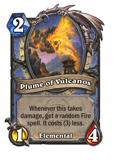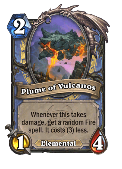 - Plume of Volcanos: 2 Mana, 1/4, Elemental. Amikor ez sebzést kap, kapsz egy véletlenszerűen kiválasztott Fire spellt. Az 3-mal kevesebbe kerül.