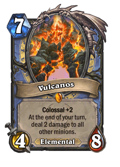 - Vulcanos: 7 Mana, 4/8, Legendary, Elemental. Colossal +2. A köröd végén 2-t sebez az összes többi lénynek.