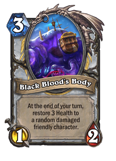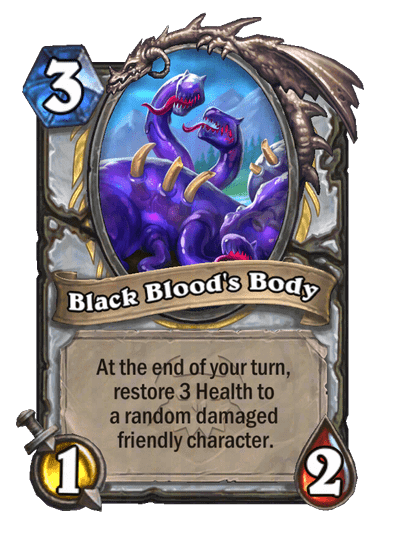 - Black Blood's Body: 3 Mana, 1/2. A köröd végén 3-at gyógyít egy véletlenszerűen kiválasztott karakterednek.