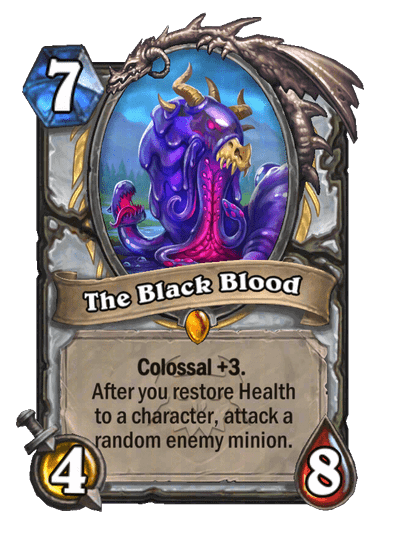 - The Black Blood: 7 Mana, 4/8, Legendary. Colossal +3. Miután gyógyítasz egy karaktert, ez megtámad egy véletlenszerűen kiválasztott ellenséges lényt.