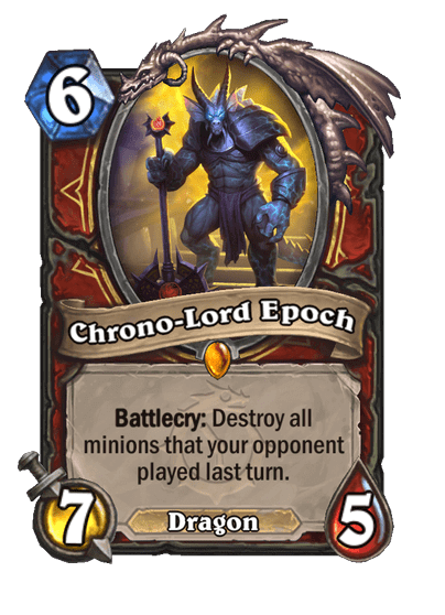 - Chrono-Lord Epoch: 6 Mana, 7/5, Legendary, Dragon. Battlecry: Elpusztítja az összes lényt, amit az ellenfeled kijatszott az előző körben.