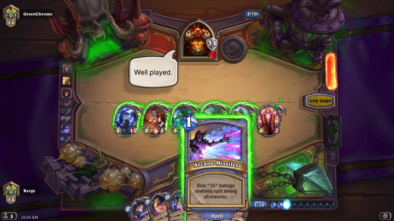 A régi, jól bevált Malygos + Prophet Velen + 2 Arcane Missile kombó még mindíg működik. Necces dolog erre építeni a paklit, de amikor kijön a kombó, az vicces tud lenni. :D Az animáció is eltartot egy darabig.