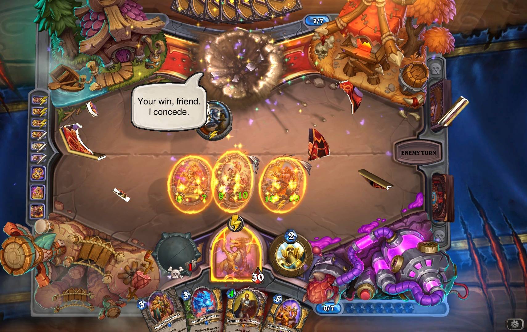 Azért ez a kombináció nem semmi. Pláne, ha még más Taunt-tal rendelkező lény is van a mezőn. Nem elég, hogy háromszor is meg kell csapni, hogy a pajzs lejöjjön, de Nozdormu, Bronze Aspect még vissza is adja minden lénynek a kör végén és akin marad az még +3/+3-t is kap.