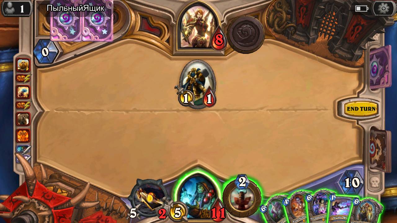 Rhonintól maradt egy Arcane Missile a kezemben, Tiriontól maradt az Ashbringer, és topdeck Justicarral lehívtam egy Wrath of Air Totemet, így pont kijött a 9 dmg.
