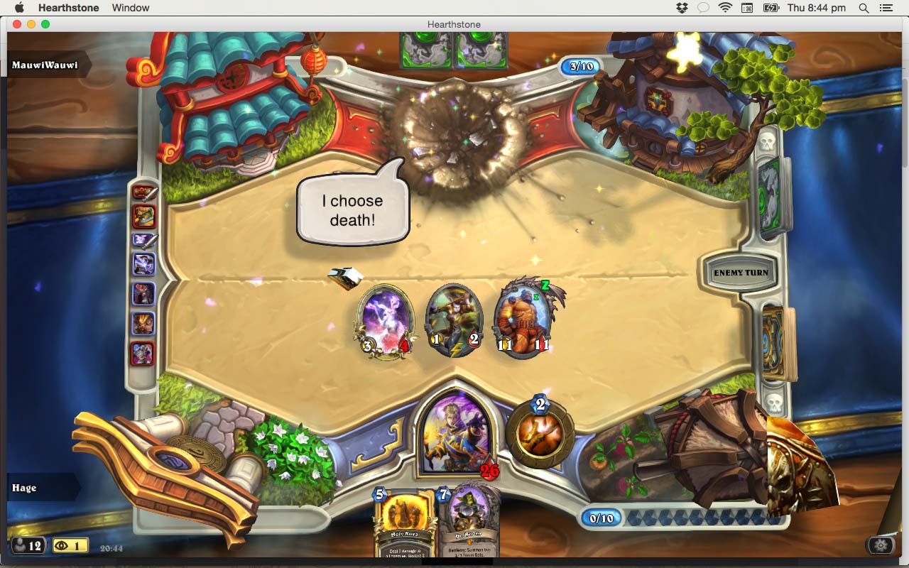 Az új control priest paklimat teszteltem, amikor azt hittem, hogy feljött egy warrior azzal a paklival, amivel mindig is szokott mostanában. A különbség annyi volt, hogy Thaddiust akarta lehozni, ami persze Feugen letétele után egyből világos volt számomra. Szóval a lényeg, hogy elloptam a legendás lapját (is...) és beaktiváltam Thaddiust. Nem volt nagy az öröme, pedig volt még a kézben más is :)