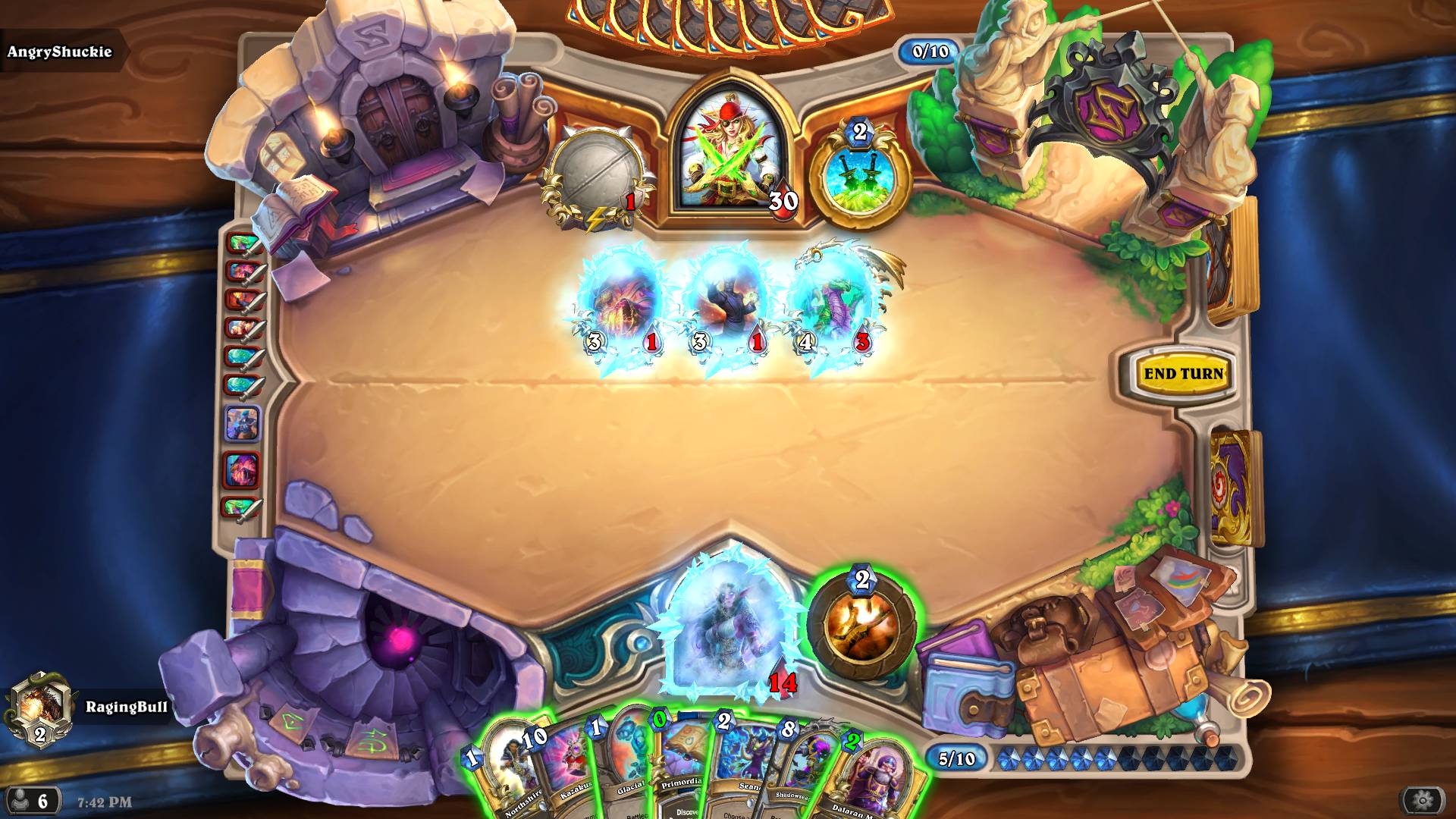 2 Water Elemental és sok más az ellenfél board-ján, erre toltam a Mass Hysteriat, fagyos lett a hangulat, de a Rogue hősre is várt egy Glacial Shard..